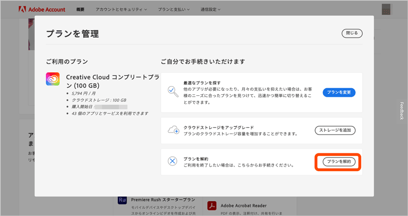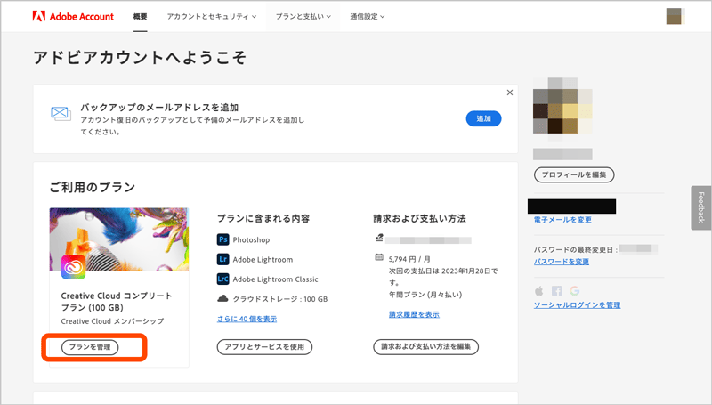 メンバーシップのプラン解約については、まず、アドビアカウントページに進んだら、ご利用のプランにある「プランを管理」というボタンをクリックorタップします。